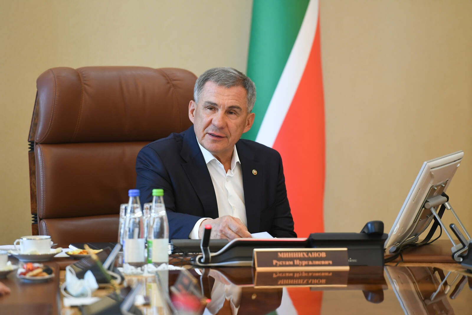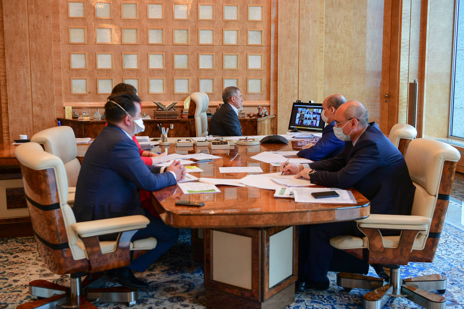 Заседание рабочей группы Государственного совета Российской Федерациипо направлению "Строительство, жилищно-коммунальное хозяйство, городская среда" в режиме видеоконференции. Проводит руководитель рабочей группы, Президент Республики Татарстан Р.Н. Минниханов.