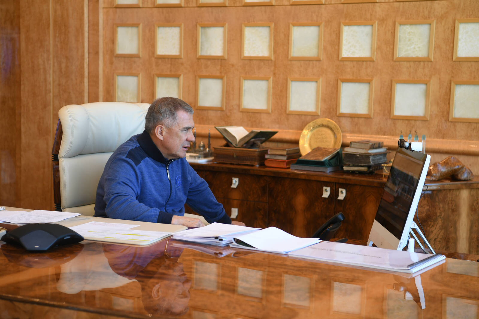 Совещание в режиме видеоконференции по вопросам реализации мер поддержки экономики и социальной сферы. Проводит Президент Российской Федерации Владимир Владимирович Путин. Принимает участие Президент Республики Татарстан Р.Н. Минниханов.