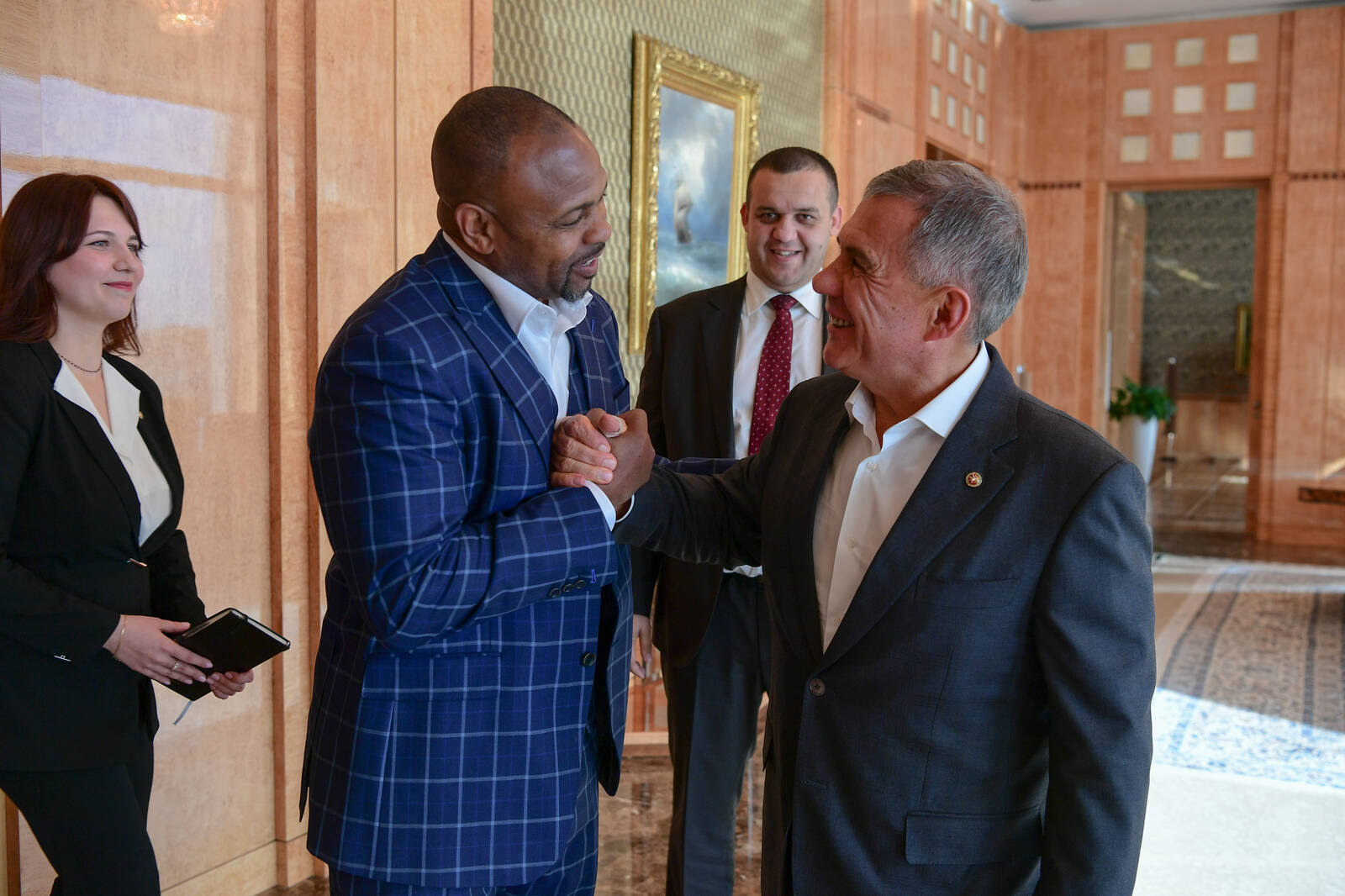 Встреча Президента Республики Татарстан Р.Н. Минниханова с Генеральным секретарем, членом исполнительного комитета Федерации бокса России Умаром Назаровичем Кремлёвым и боксером, многократным чемпионом мира по боксу Роем Джонсом-младшим