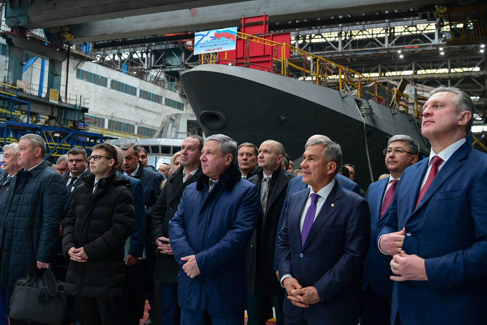 Торжественная церемония закладки корпуса пассажирского судна проекта № 03622 "Чайка" на сжиженном природном газе (СПГ). Принимает участие Президент Республики Татарстан Р.Н.Минниханов.