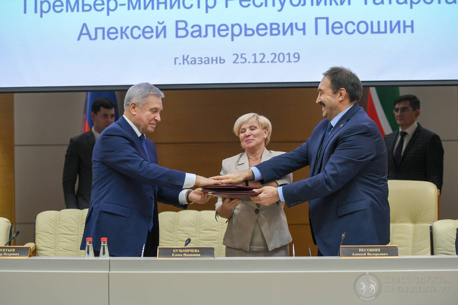 Подписание Соглашения между Федерацией профсоюзов Республики Татарстан, Координационным советом объединений работодателей Республики Татарстан, Кабинетом Министров Республики Татарстан о минимальной заработной плате в Республике Татарстан. Принимает участие Премьер-министр Республики Татарстан А.В. Песошин.