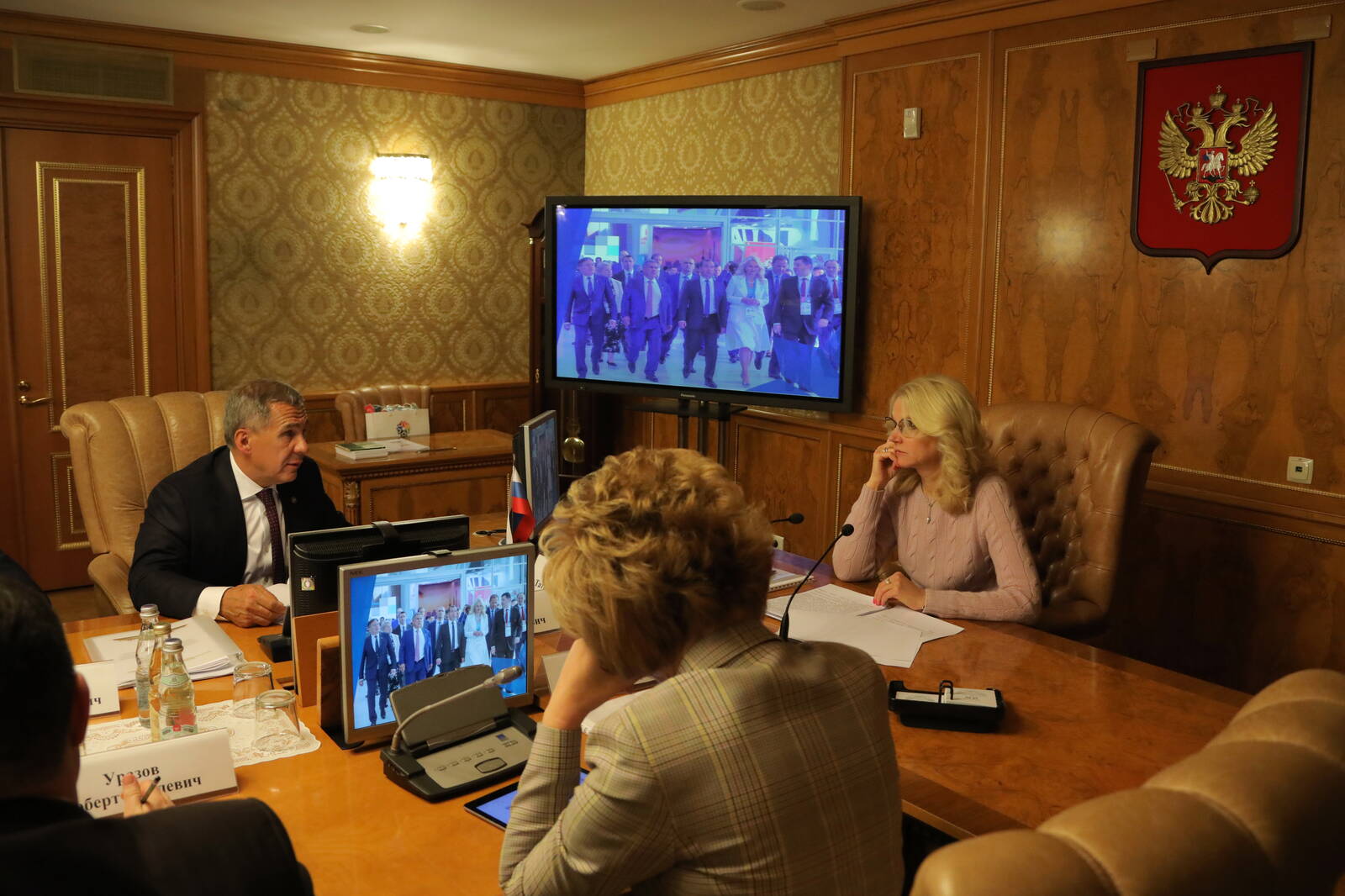 Заседание организационного комитета по подготовке и проведению мирового чемпионата по профессиональному мастерству по стандартам "Ворлдскиллс" в г. Казани в 2019 году.Проводит Заместитель Председателя Правительства Российской Федерации Татьяна Алексеевна Голикова. Принимает участие Президент Республики Татарстан Р.Н. Минниханов.