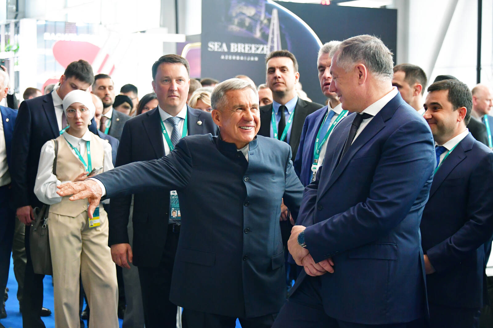 Осмотр Раисом Республики Татарстан Р.Н.Миннихановым, Заместителем Председателя Правительства России М.Ш.Хуснуллиным, Министром строительства и жилищно-коммунального хозяйства России И.Э.Файзуллиным выставки недвижимости и инфраструктурных проектов
