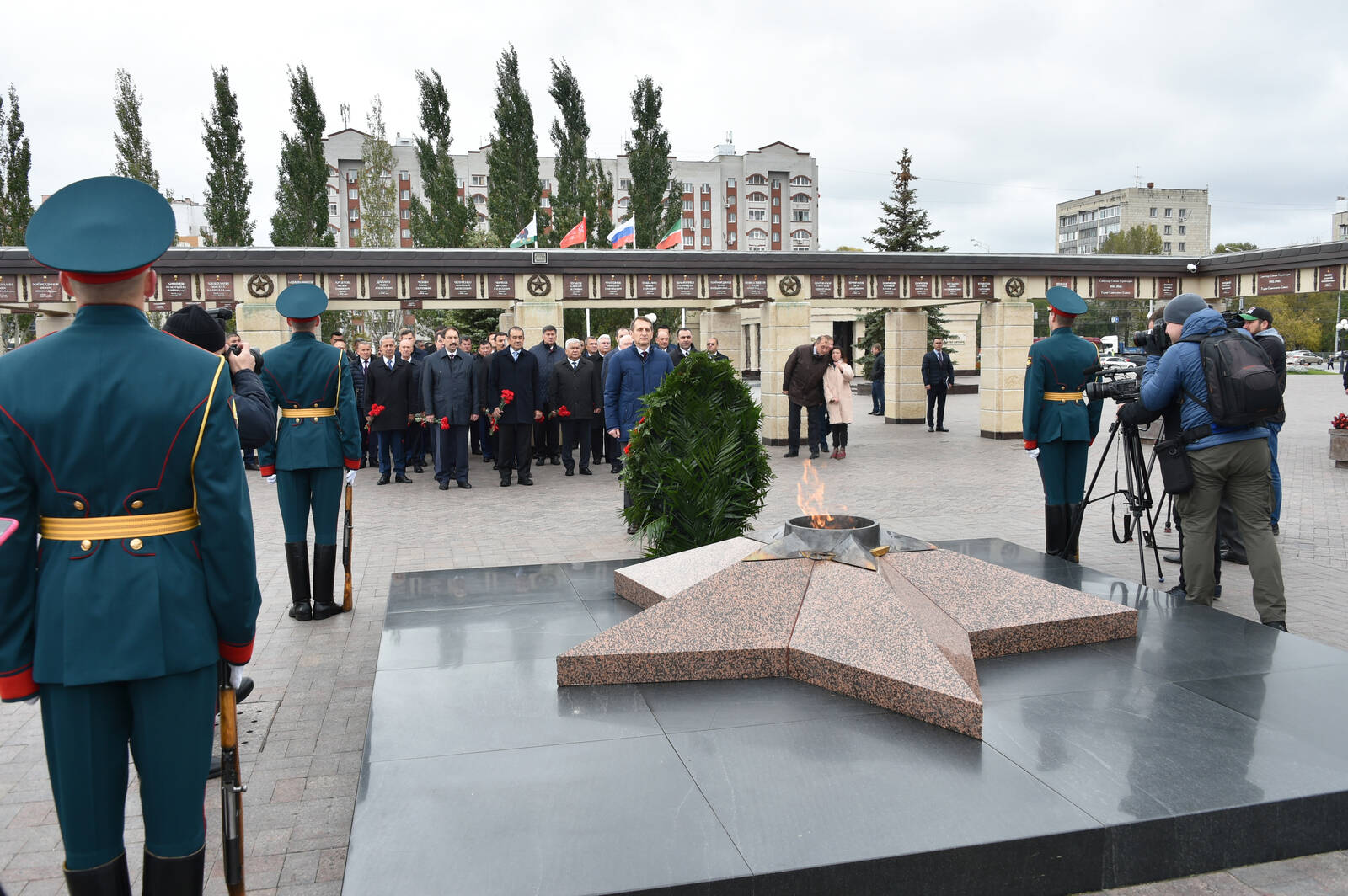 Возложение венка и цветов к Вечному огню Колоннады Мемориала Славы. Принимают участие Директор Службы внешней разведки С.Е. Нарышкин и Премьер-министр Республики Татарстан А.В. Песошин.