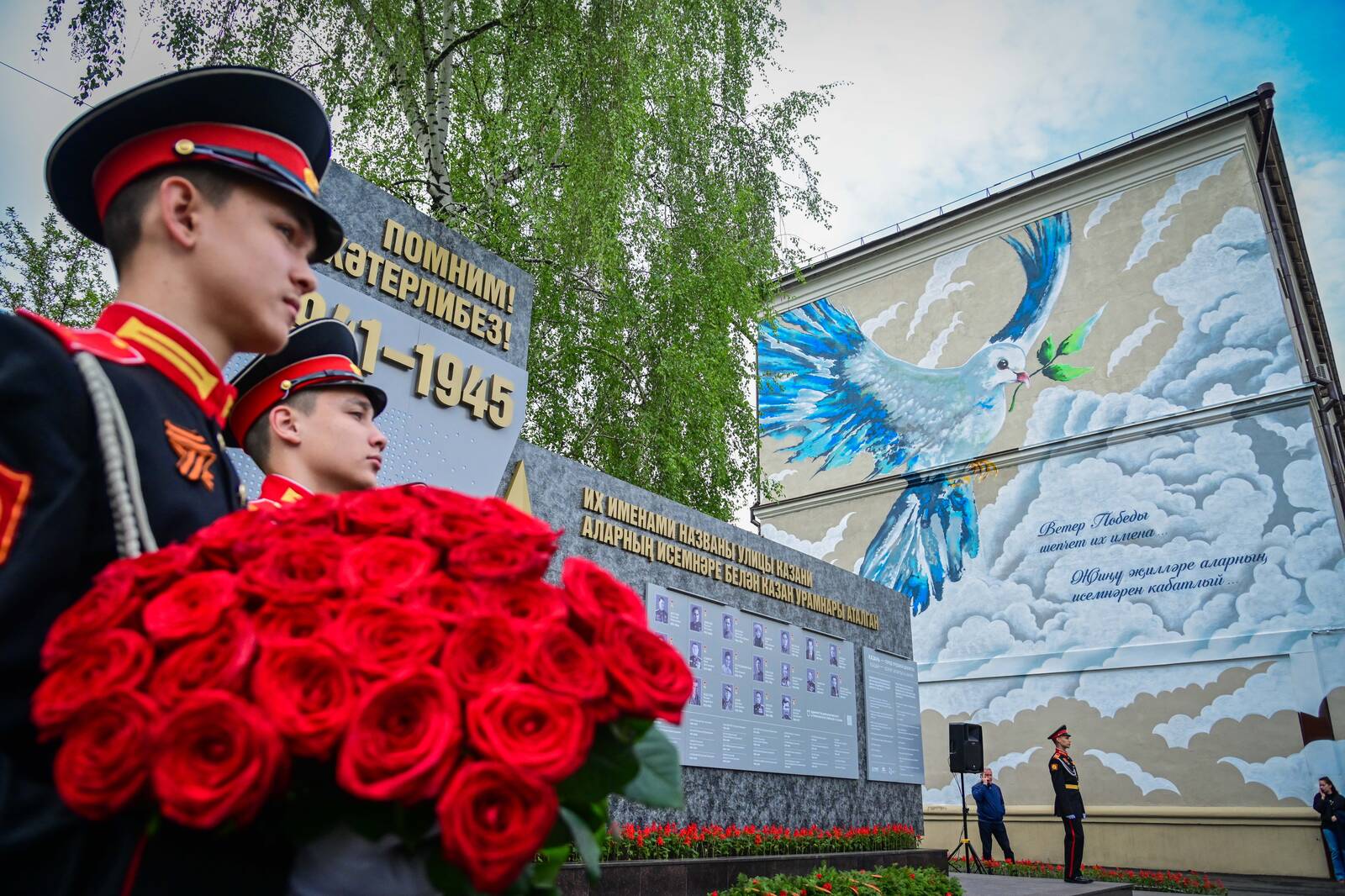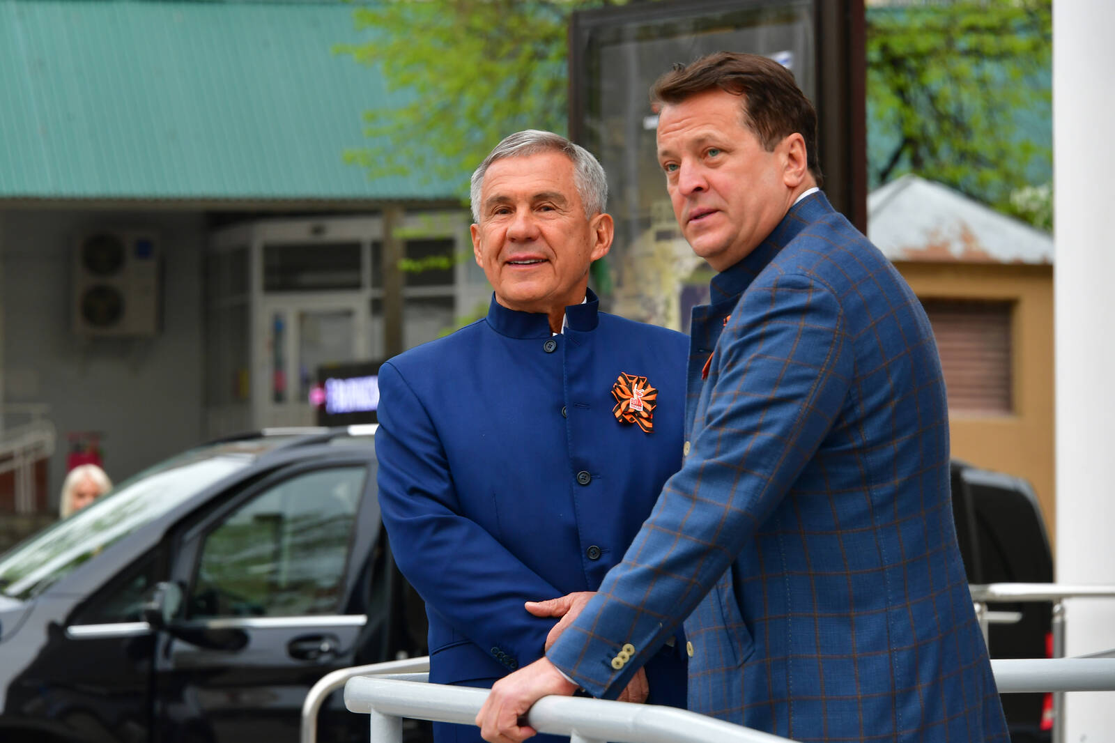 Возложение Раисом Республики Татарстан Р.Н.Миннихановым цветов к стеле в честь 80-летия Победы в Великой Отечественной войне 1941-1945 гг. Посещение двора, благоустроенного по программе «Наш двор».