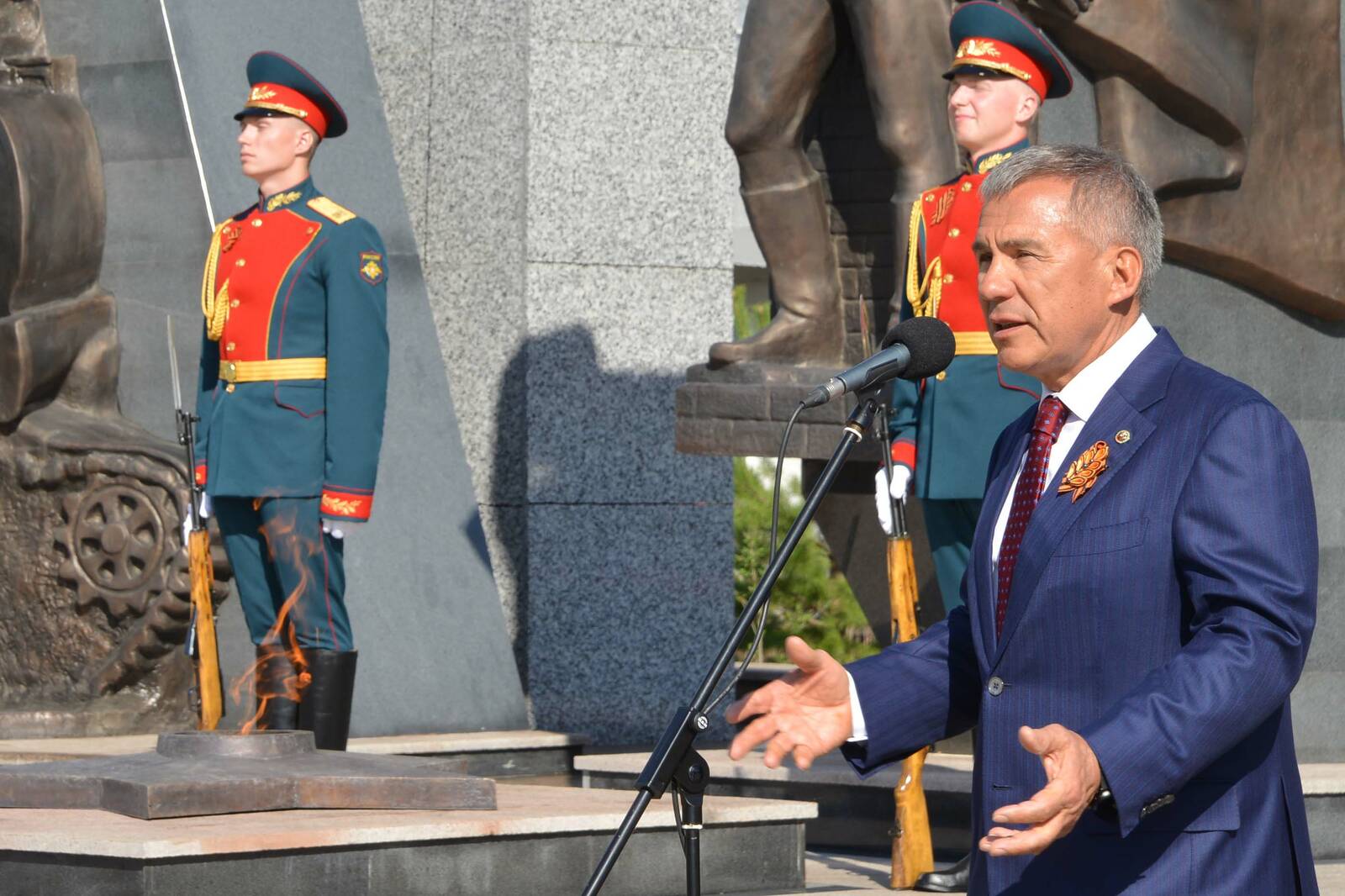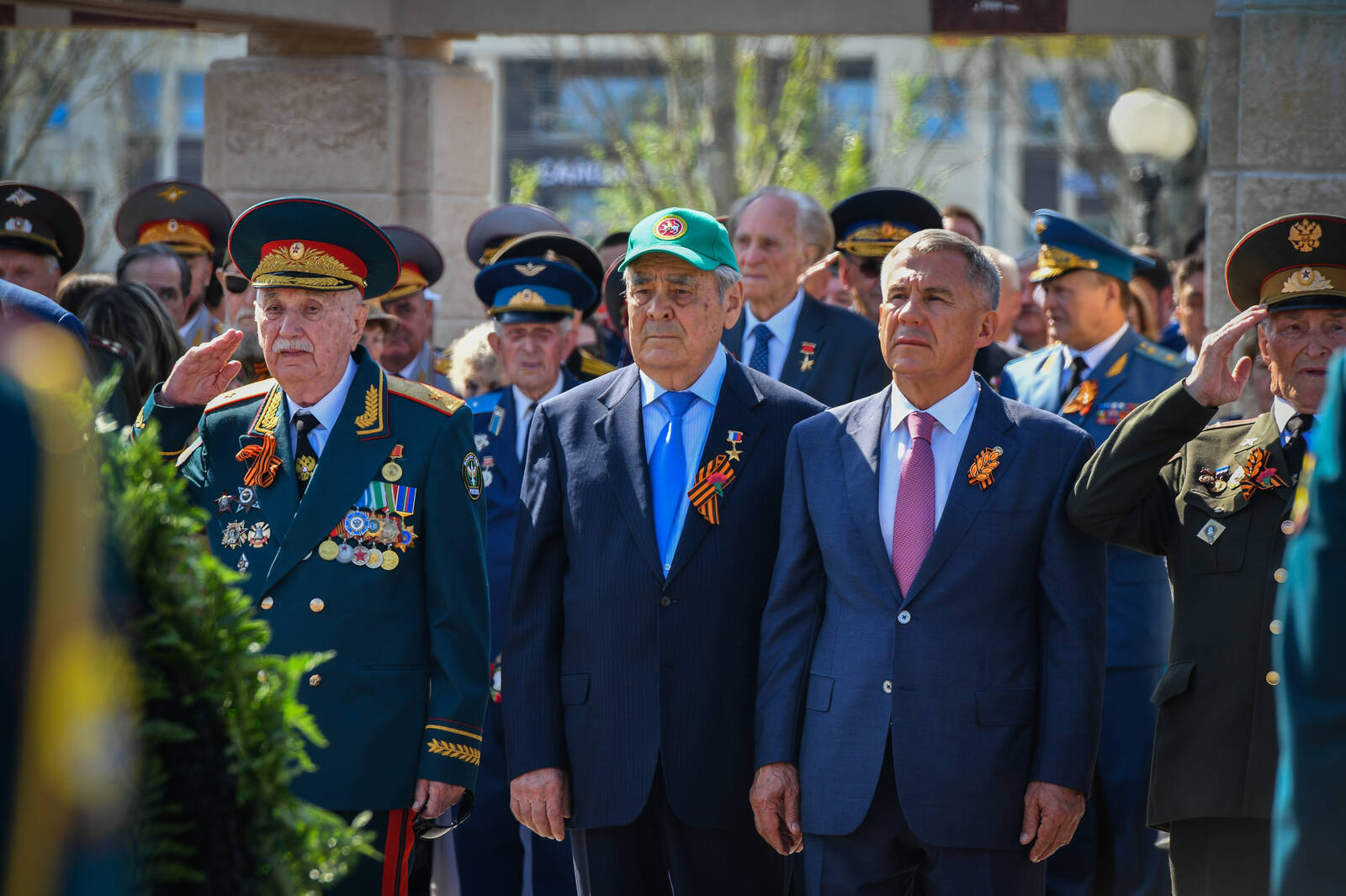 Торжественная церемония возложения цветов и венков к Вечному огню Колоннады Мемориала Славы. Принимает участие Президент Республики Татарстан Р.Н. Минниханов