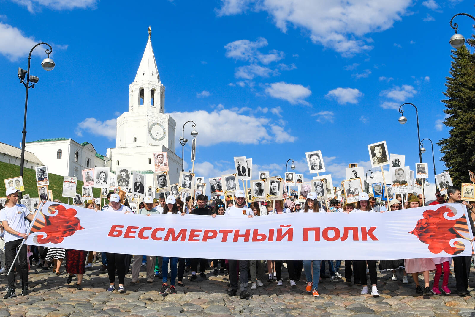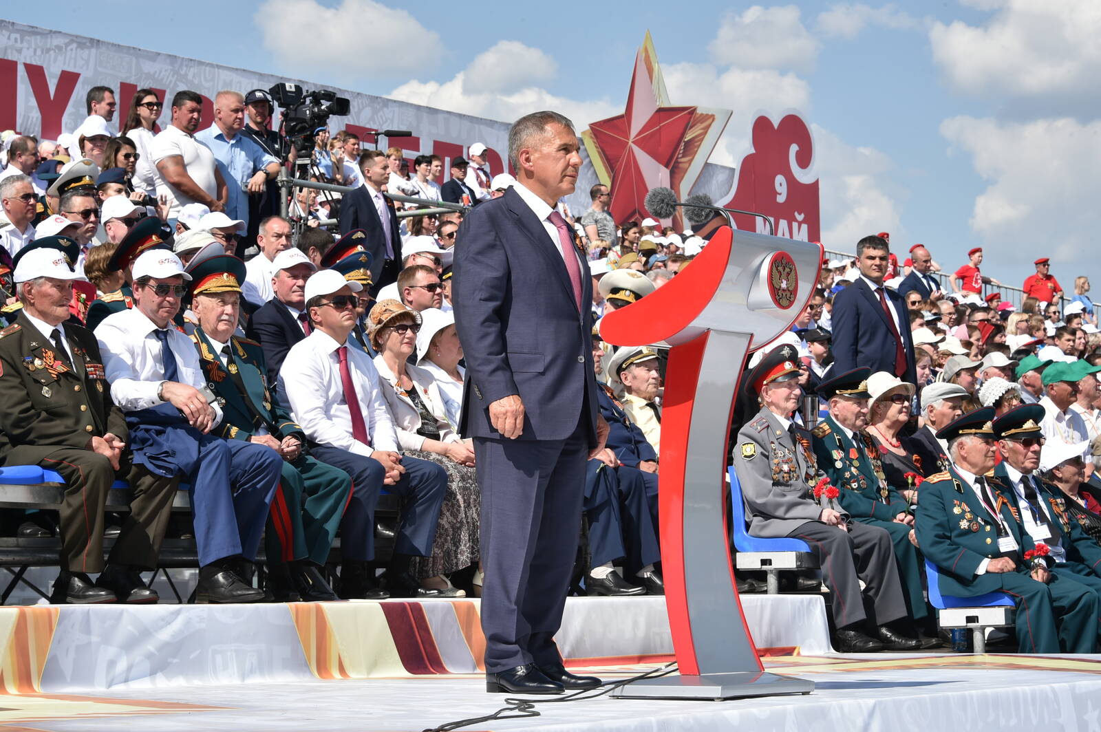 Торжественное прохождение войск Казанского гарнизона по случаю празднования 74-й годовщины Победы в Великой Отечественной войне 1941-1945 гг. Принимает участие Президент Республики Татарстан Р.Н. Минниханов