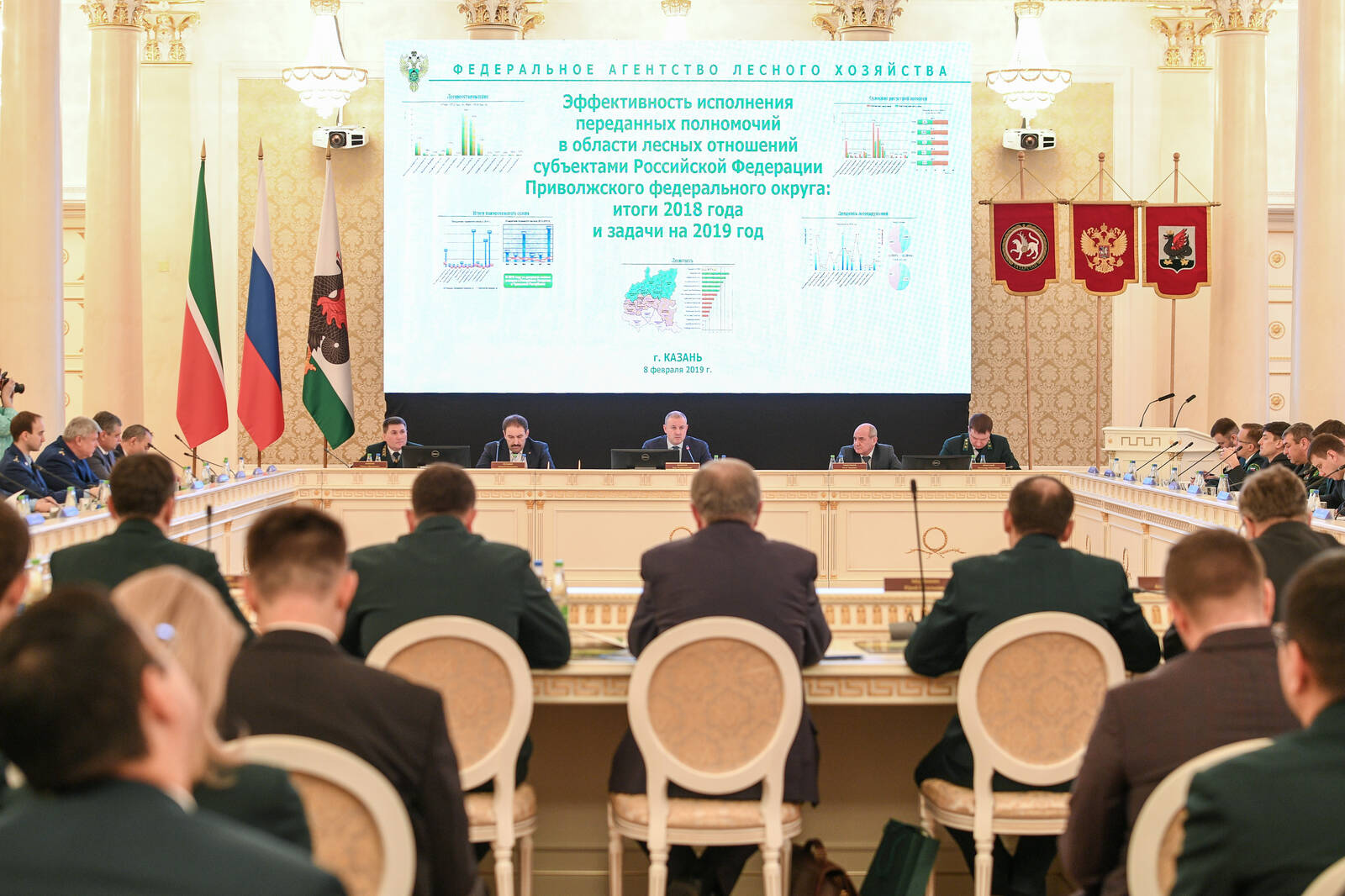 Совещание Федерального агентства лесного хозяйства на тему: «Эффективность исполнения переданных полномочий в области лесных отношений Российской Федерации Приволжского федерального округа: итоги 2018 года и задачи на 2019 год». Проводит заместитель министра природных ресурсов и экологии Российской Федерации - руководитель Федерального агентства лесного хозяйства Иван Владимирович Валентик. Принимает участие Премьер-министр Республики Татарстан А.В.Песошин.