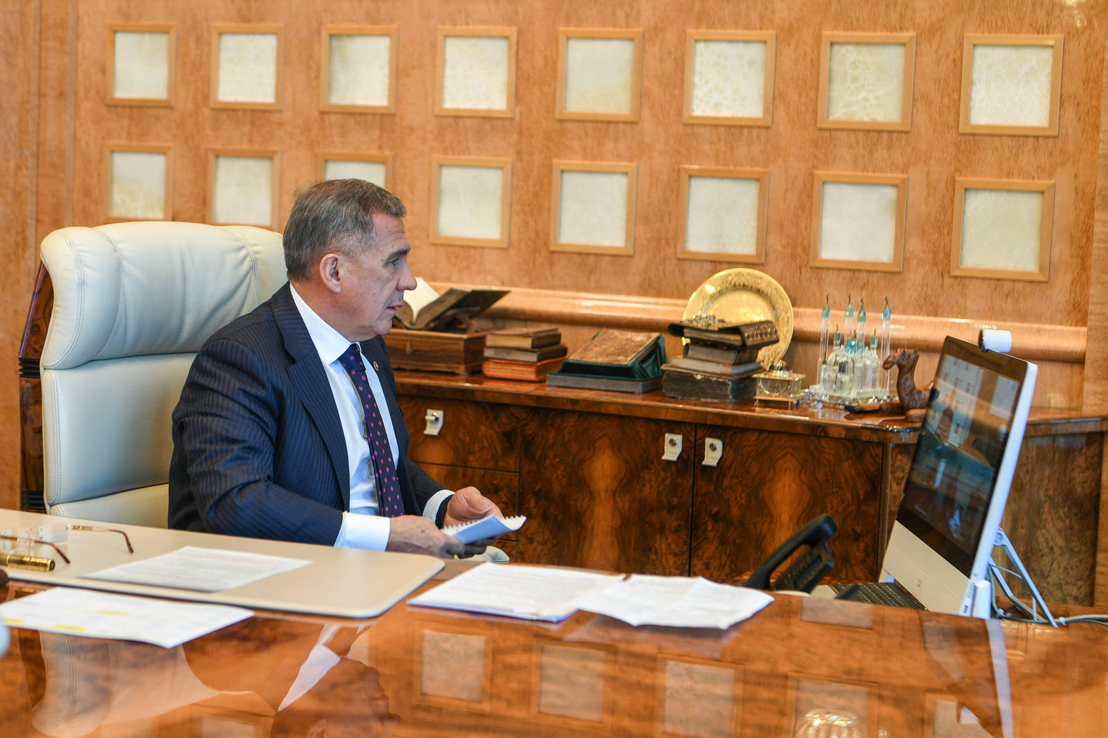 Совещание в режиме видеоконференции с губернаторами регионов Ассоциации инновационных регионов России. Проводит Президент Республики Татарстан Р.Н. Минниханов.