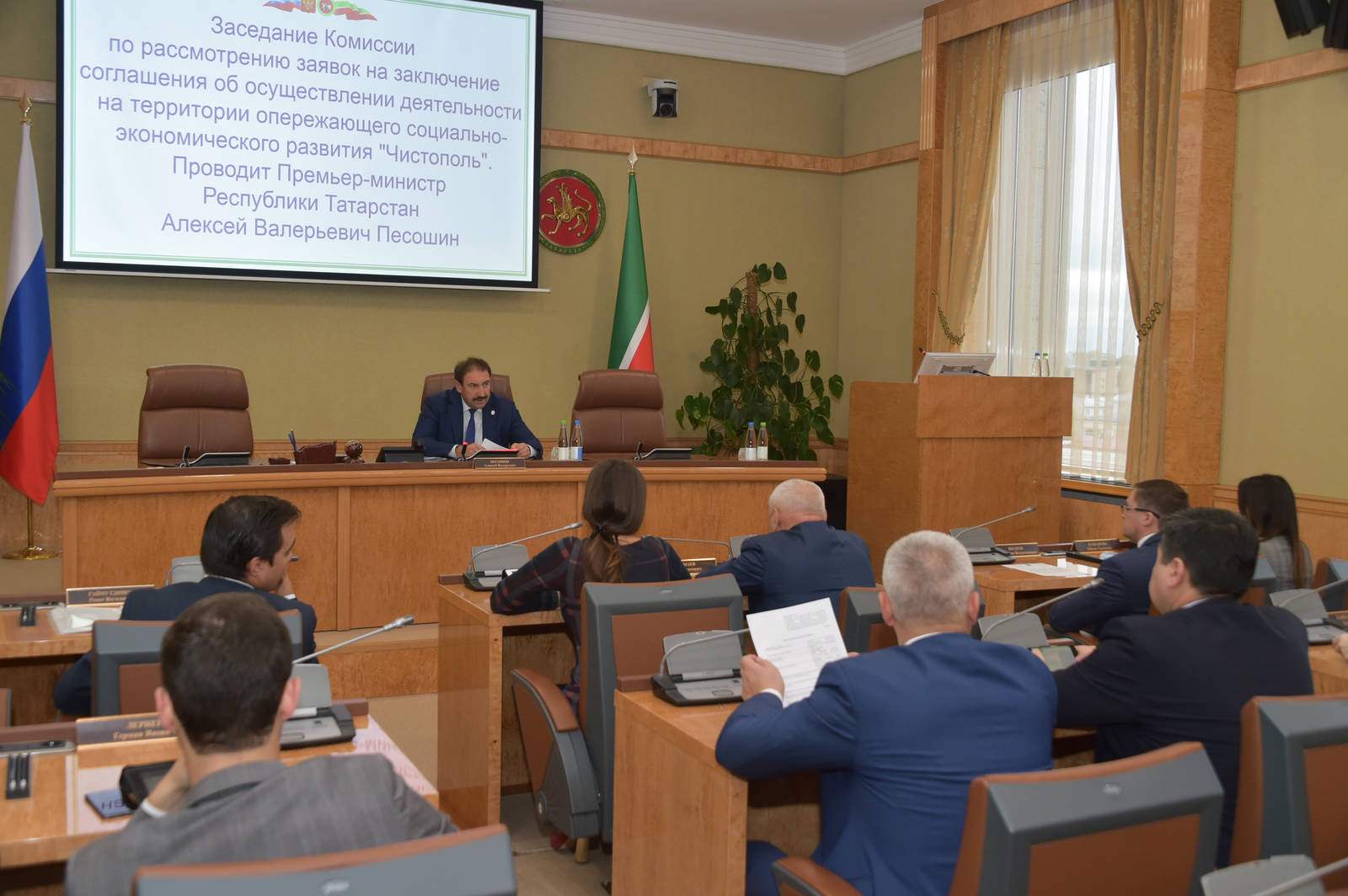 Заседание Комиссии по рассмотрению заявок на заключение соглашения об осуществлении деятельности на территории опережающего социально-экономического развития "Чистополь". Проводит Премьер-министр Республики Татарстан А.В. Песошин.