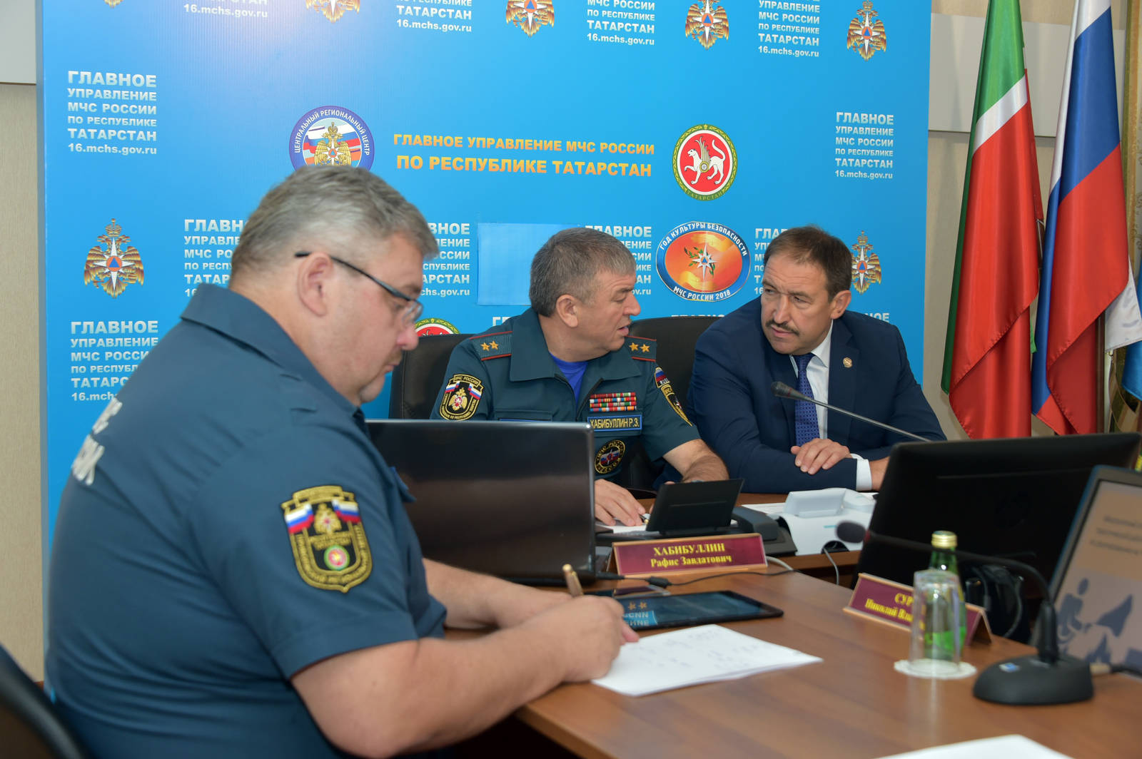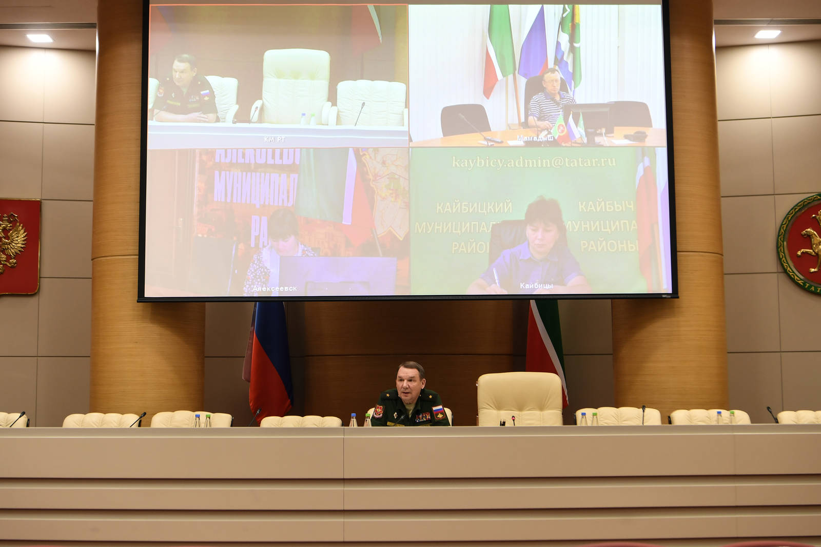 Совещание в режиме видеоконференции по вопросам организации взаимодействия между Министерством Российской Федерации по делам гражданской обороны, чрезвычайным ситуациям и ликвидации последствий стихийных бедствий и субъектами Российской Федерации. Принимает участие Премьер-министр Республики Татарстан А.В. Песошин.
