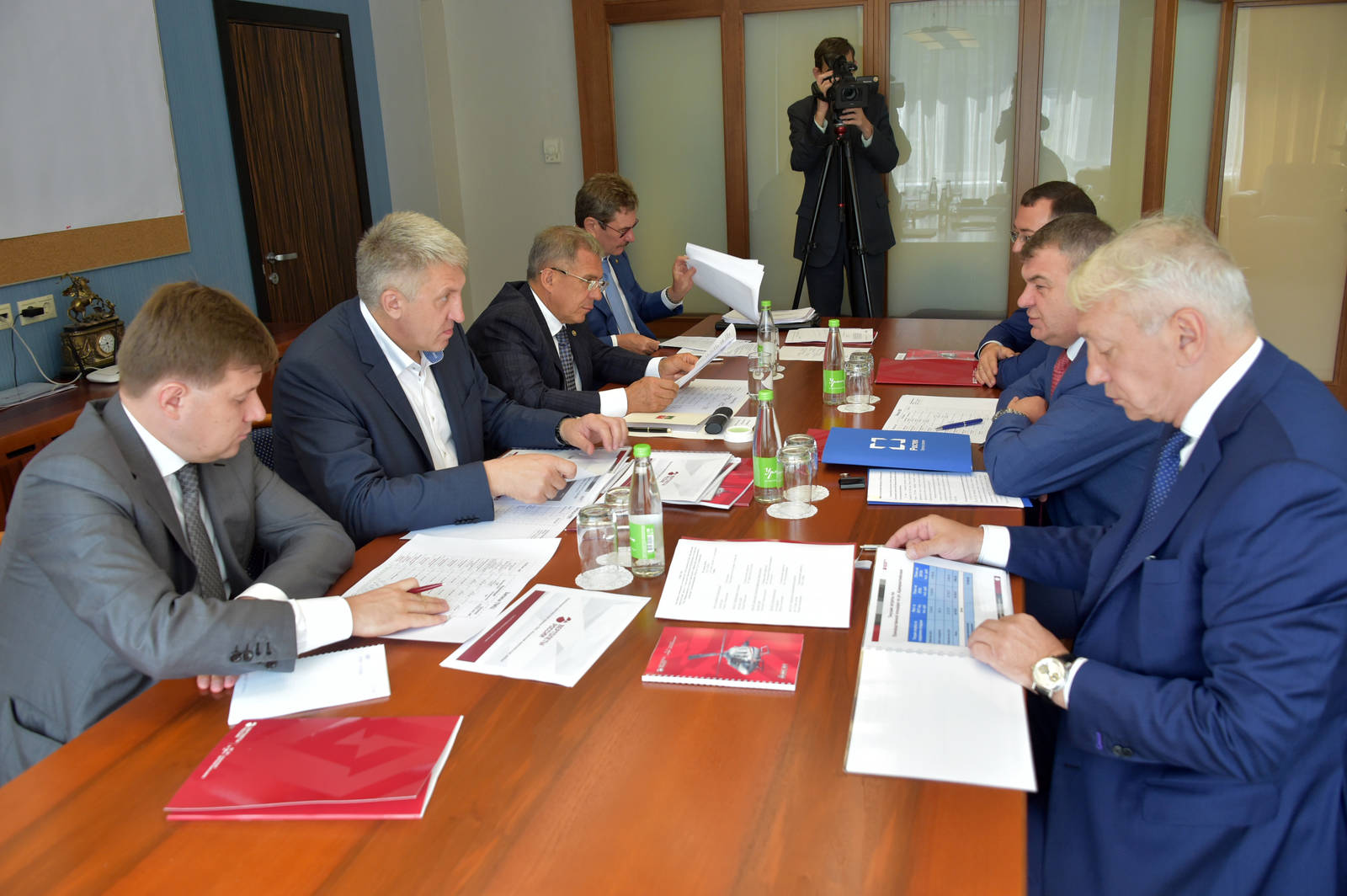 Совещание в ПАО «Казанский вертолетный завод» с участием Президента Республики Татарстан Р.Н. Минниханова и индустриального директора госкорпорации «Ростех» А.Э. Сердюкова.