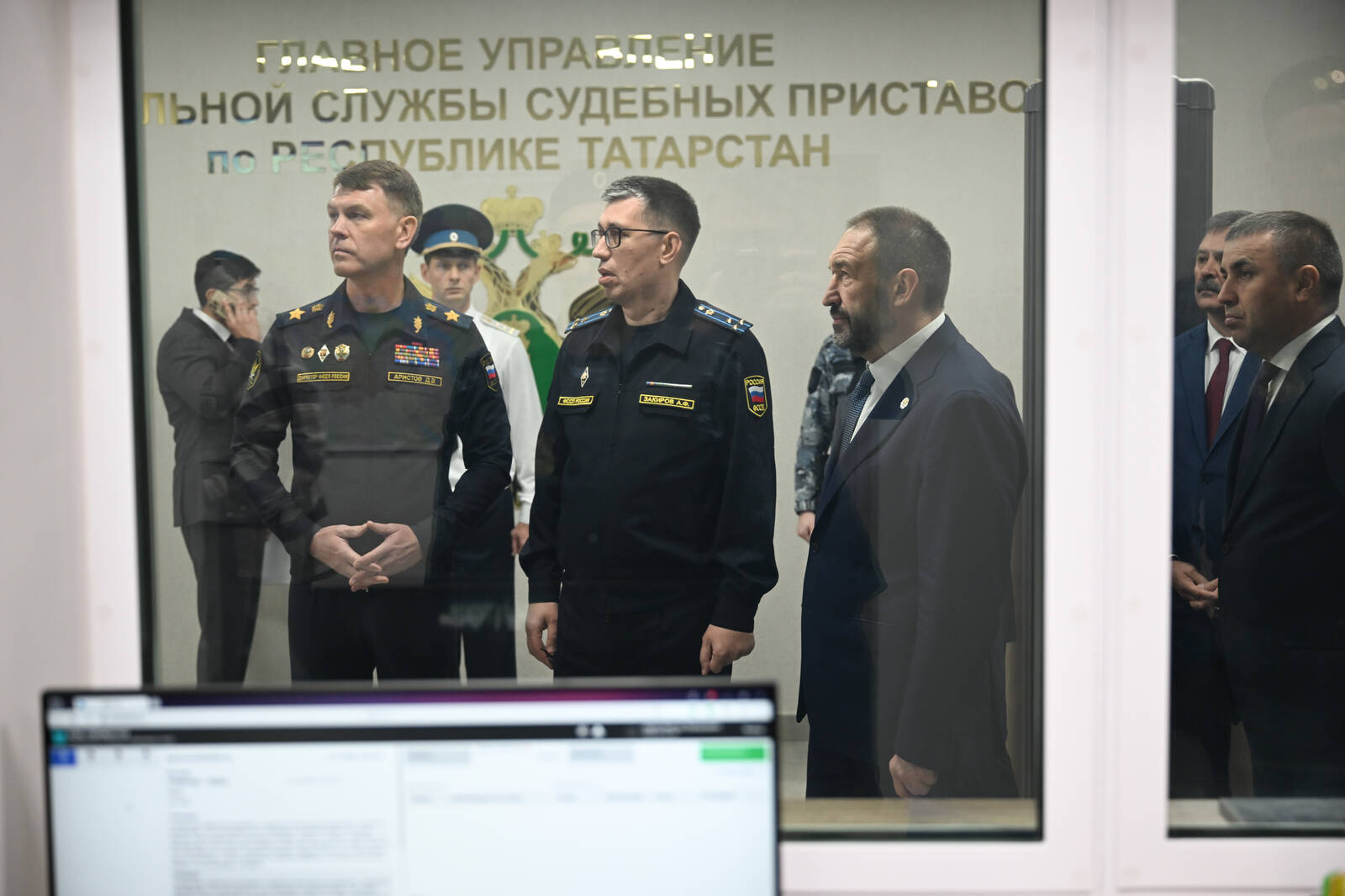 Осмотр нового здания Главного управления Федеральной службы судебных приставов по Республике Татарстан. Принимают участие директор Федеральной службы судебных приставов — главный судебный пристав Российской Федерации Дмитрий Васильевич Аристов и Премьер-министр Республики Татарстан А.В.Песошин.