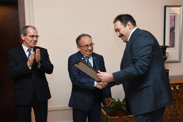 Вручение Премьер-министром Республики Татарстан А.В. Песошиным Международной премии имени А.Н. Туполева за выдающийся вклад в области инженерных наук члену-корреспонденту Российской академии наук А. А. Иноземцеву. Фото: Михаил Фролов