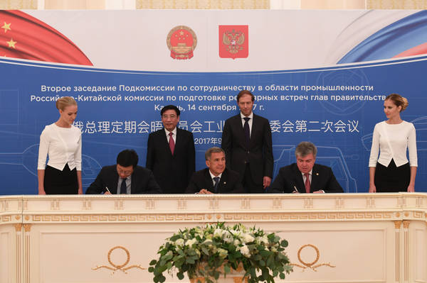 Расширенное заседание Межправительственной Подкомиссии по сотрудничеству в области промышленности Российско-Китайской комиссии по подготовке регулярных встреч глав правительств. Принимают участие Министр промышленности и торговли Российской Федерации Денис Валентинович Мантуров и Президент Республики Татарстан Р.Н. Минниханов. Фото Марсель Бадыкшин