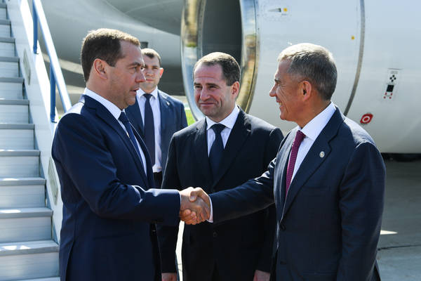 Прибытие в Республику Татарстан Председателя Правительства Российской Федерации Дмитрия Анатольевича Медведева. Встречает Президент Республики Татарстан Р.Н. Минниханов. Фото: Михаил Фролов