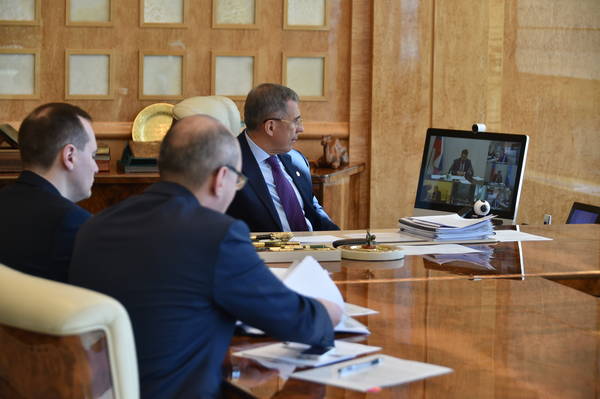 Совещание с руководителями субъектов Российской Федерации - членов Ассоциации инновационных регионов России в режиме видеоконференции. Проводит Президент Республики Татарстан Р.Н. Минниханов.