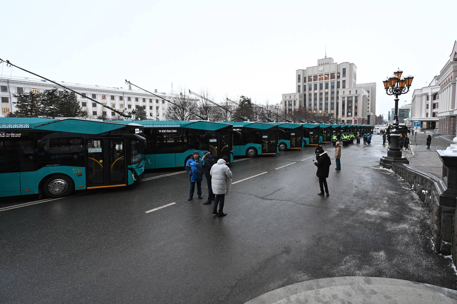 Церемония передаче Казани новых троллейбусов МАЗ-303Т22. Принимает участие Раис Республики Татарстан Р.Н. Минниханов.