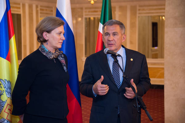Заседание коллегии Управления Роспотребнадзора по Республике Татарстан «Итоги деятельности органов и организаций Федеральной службы по надзору в сфере защиты прав потребителей и благополучия человека в Республике Татарстан в 2015 году и задачи на 2016 год». Принимают участие Руководитель Федеральной службы по надзору в сфере защиты прав потребителей и благополучия человека Анна Юрьевна Попова, Президент Республики Татарстан Р.Н. Минниханов. Фото: Михаил Фролов