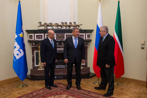 Встреча Президента Республики Татарстан Р.Н. Минниханова c Президентом FINA Хулио Маглионе, Исполнительным директором FINA Корнелем Маркулеску. Фото: Михаил Фролов