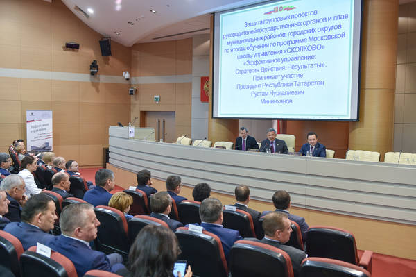 Защита групповых проектов руководителей государственных органов и глав муниципальных районов, городских округов по итогам обучения по программе Московской школы управления «СКОЛКОВО» «Эффективное управление: Стратегия. Действия. Результаты». Принимает участие Президент Республики Татарстан Р.Н. Минниханов. Фото Марсель Бадыкшин