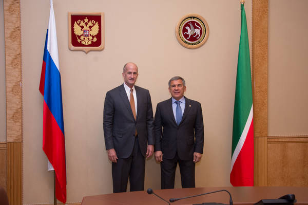 Встреча Президента Республики Татарстан Р.Н. Минниханова с президентом и исполнительным директором по стратегическом развитию, вице-председателем компании General Electric Джоном Дж. Райсом. Фото: Михаил Фролов