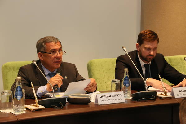 Совещание на тему «Об организации разработки и внедрения инновационных технологий мониторинга состояния и прогнозирования развития межнациональных отношений и раннего предупреждения межнациональных конфликтов» с участием руководителя Федерального агентства по делам национальностей Игоря Вячеславовича Баринова. Проводит Президент Республики Татарстан Р.Н.Минниханов.: фото Михаила Козловского