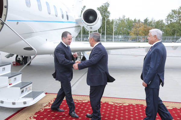 Прибытие в Республику Татарстан Полномочного представителя Президента РФ в Приволжском Федеральном округе М.В.Бабича. Встречает врио Президента РТ Р.Н.Минниханов. Фото Эдуард Миргазизов