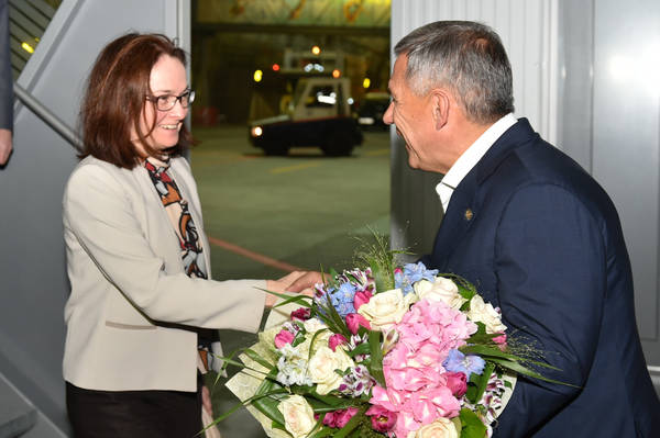 Прибытие в Республику Татарстан председателя Центрального банка Российской Федерации Эльвиры Сахипзадовны Набиуллиной. Встречает временно исполняющий обязанности Президента Республики Татарстан Р.Н. Минниханов. Фото Марсель Бадыкшин