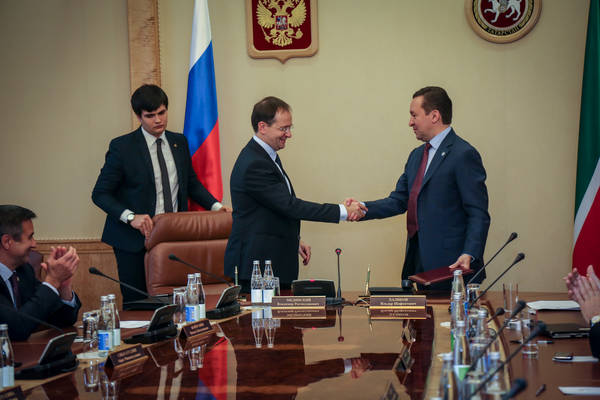 Церемония подписания Протокола о намерениях «О создании регионального отделения «Российского военно-исторического общества» в Татарстане. Принимают участие министр культуры РФ В.Р.Мединский и Премьер-министр РТ И.Ш.Халиков