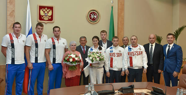 Встреча временно исполняющего обязанности Президента Республики Татарстан Р.Н. Минниханова со спортсменами Республики Татарстан – победителями XVI чемпионата мира по водным видам спорта в г.Казани. Фото Марсель Бадыкшин
