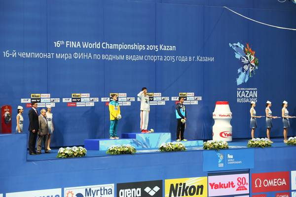 XVI Чемпионат мира по водным видам спорта 2015 года. Участие Государственного Советника Республики Татарстан М.Ш. Шаймиева в церемонии награждения победителей соревнований по плаванию : фото Михаила Козловского
