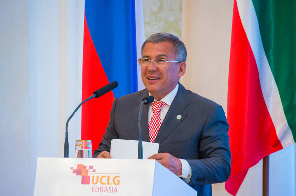 Открытие Конгресса Евразийского регионального отделения Всемирной организации «Объединенные города и местные власти». Принимает участие временно исполняющий обязанности Президента Республики Татарстан Р.Н. Минниханов. Фото: Михаил Фролов