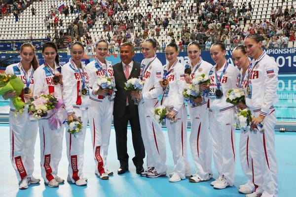 Посещение временно исполняющим обязанности Президента Республики Татарстан Р.Н. Миннихановым соревнований по синхронному плаванию 16-го Чемпионата мира ФИНА по водным видам спорта : фото Михаила Козловского