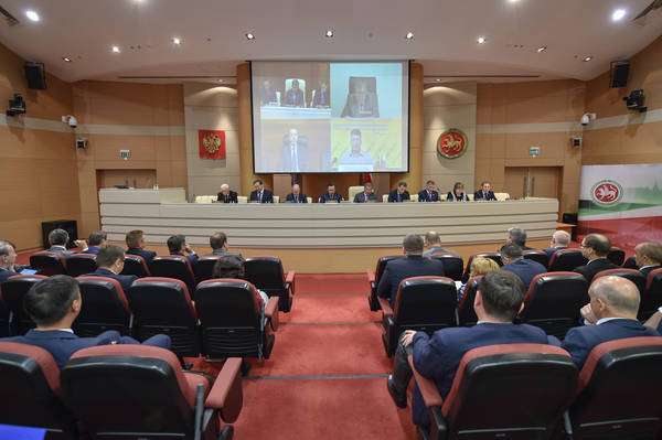 Республиканское совещание финансовых, казначейских и налоговых органов республики в режиме видеоконференции «Об итогах исполнения консолидированного бюджета Республики Татарстан за 1 полугодие 2015 года и задачах финансовых, казначейских и налоговых органов Республики Татарстан до конца 2015 года». Проводит временно исполняющий обязанности Президента Республики Татарстан Р.Н. Минниханов. Фото Марсель Бадыкшин