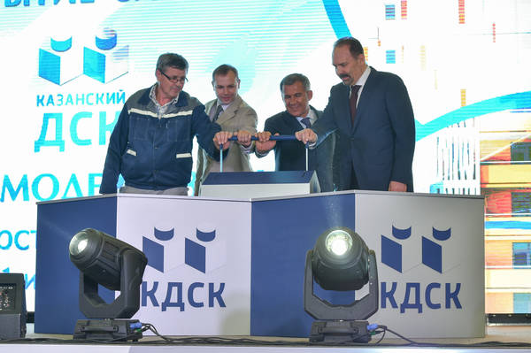 Церемония открытия модернизированной линии производства на ООО «Казанский ДСК». Принимают участие Министр строительства и жилищно-коммунального хозяйства Российской Федерации Михаил Александрович Мень и временно исполняющий обязанности Президента Республики Татарстан Р.Н. Минниханов. Фото Марсель Бадыкшин