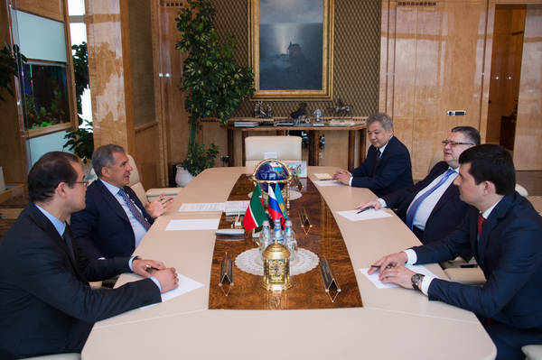 Встреча временно исполняющего обязанности Президента РТ Р.Н.Минниханова с Чрезвычайным и Полномочным Послом Республики Казахстан в РФ Маратом Муханбетказиевичем Тажиным. Фото: Михаил Фролов