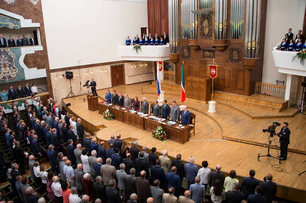 Торжественное собрание депутатов и общественности Республики Татарстан, посвященное 25-летию становления парламентаризма в современной истории Татарстана. Принимают участие Председатель Совета Федерации Федерального Собрания Российской Федерации В.И. Матвиенко временно исполняющий обязанности Президента Республики Татарстан Р.Н.Минниханов. Фото: Михаил Фролов