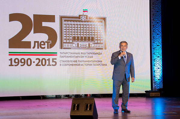 Торжественная встреча депутатов татарстанского парламента созывов 1990-2015 гг.. Принимает участие временно исполняющий обязанности Президента Республики Татарстан Р.Н.Минниханов. Фото: Михаил Фролов