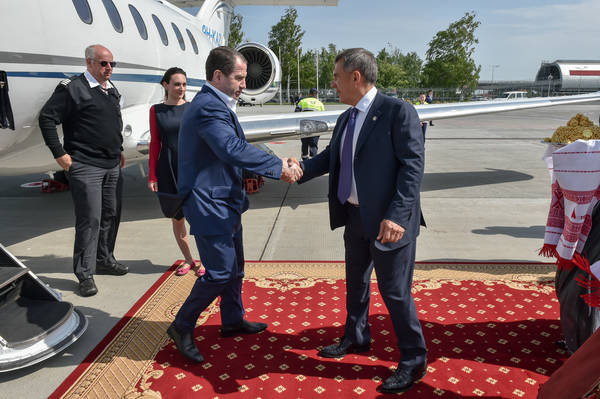 Прибытие в Республику Татарстан Полномочного представителя Президента Российской Федерации в Приволжском федеральном округе Михаила Викторовича Бабича. Встречает временно исполняющий обязанности Президента Республики Татарстан Р.Н.Минниханов. Фото Марсель Бадыкшин