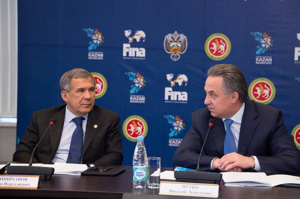 Заседание Организационного комитета по подготовке и проведению XVI чемпионата мира по водным видам спорта. Проводит Министр спорта Российской Федерации Виталий Леонтьевич Мутко. Принимает участие временно исполняющий обязанности Президента Республики Татарстан Р.Н.Минниханов. Фото: Михаил Фролов