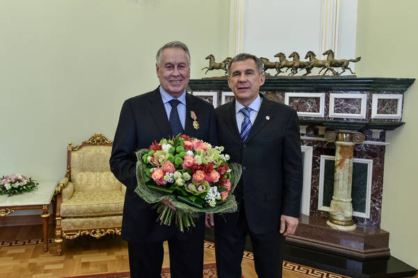 Вручение Президентом РТ Р.Н.Миннихановым награды народному артисту РСФСР и РТ, лауреату Государственной премии Республики Татарстан им. Г.Тукая А.Ш.Шакирову. Фото Марсель Бадыкшин