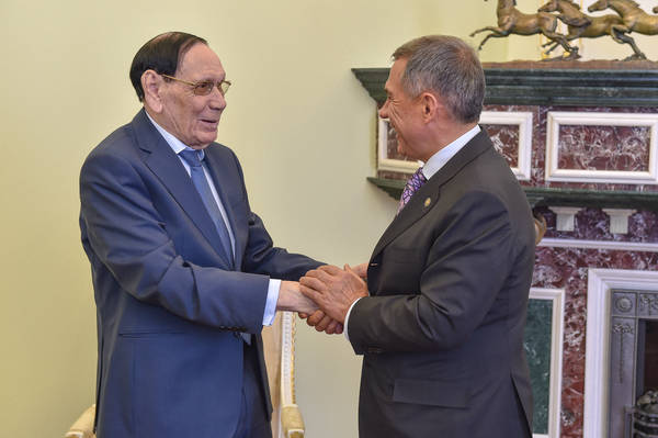 Поздравление Президентом Республики Татарстан Р.Н. Миннихановым народного артиста Российской Федерации и Республики Татарстан, лауреата Государственной премии Республики Татарстан им.Г.Тукая И.Г.Шакирова с 80-летием со дня рождения, вручение ему медали Республики Татарстан «За доблестный труд». Фото Марсель Бадыкшин