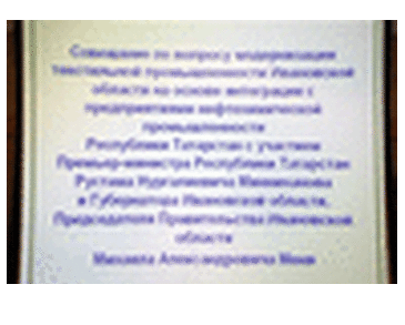 Мероприятие: Совещание по вопросу модернизации текстильной промышленности Ивановской области на основе интеграции с предприятиями нефтехимической промышленности Республики Татарстан с участием Премьер-министра Республики Татарстан Р.Н.Минниханова и Губернатора Ивановской области, Председателя Правительства Ивановской области Михаила Александровича Меня 20.05.2009