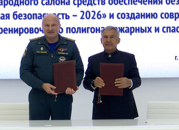 Мероприятие: Подписание соглашения между Министерством Российской Федерации по делам гражданской обороны, чрезвычайным ситуациям и ликвидации последствий стихийных бедствий и Республикой Татарстан о намерениях по подготовке и проведению в 2026 году Салона и созданию учебно-тренировочного полигона пожарных и спасателей. Подписывают Министр Российской Федерации по делам гражданской обороны, чрезвычайным ситуациям и ликвидации последствий стихийных бедствий А.В.Куренков, Раис Республики Татарстан Р.Н.Минниханов. 16.07.2025